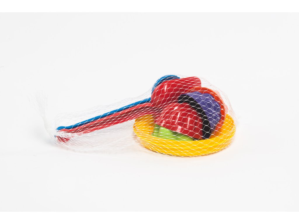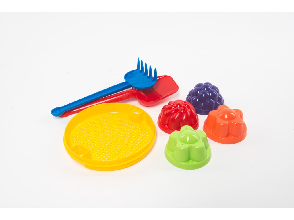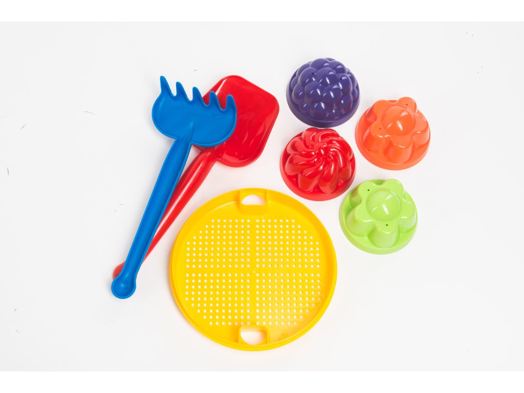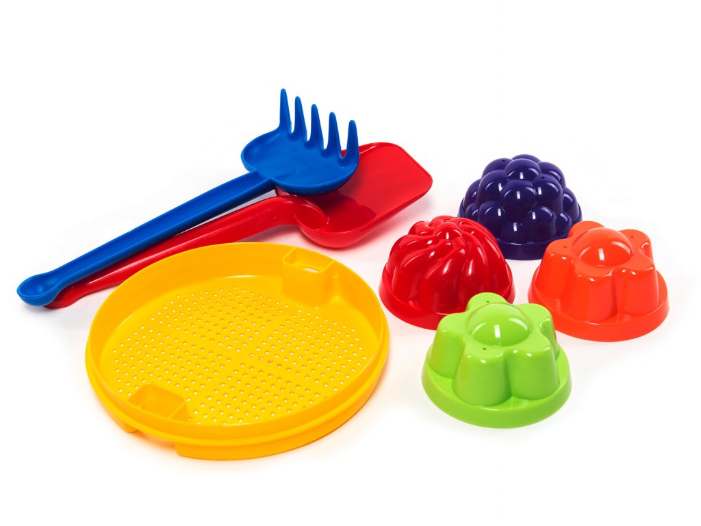 Klasické dětské plastové formičky na písek včetně hrabiček, lopatky a sítka z plastu v různých